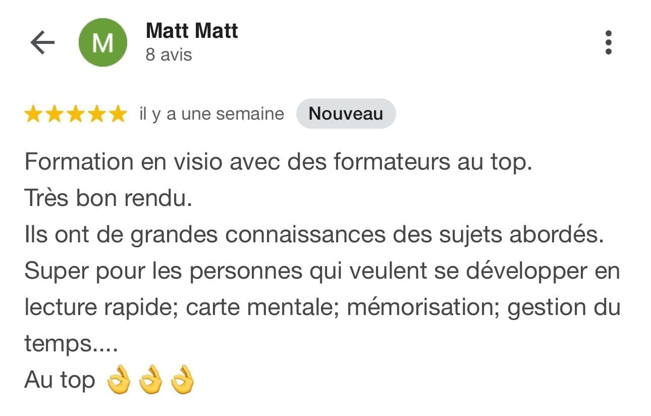 👉 Important : la formation REBOOT inclut une certification officielle (RS6398) sur la lecture rapide et la carte mentale, obligatoire pour toute inscription via le CPF. Une convocation est envoyée après l'acquisition des modules de lecture rapide et de carte mentale. Plusieurs dates seront proposées pour faciliter l'agenda de l'apprenant.